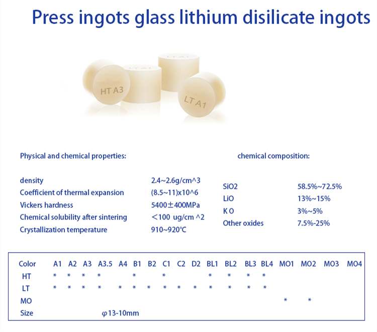 Material de equipamento odontológico para laboratório odontológico cerâmicas de vidro lingotes de prensagem de dissilicato de lítio Dental Lithium HT/LT